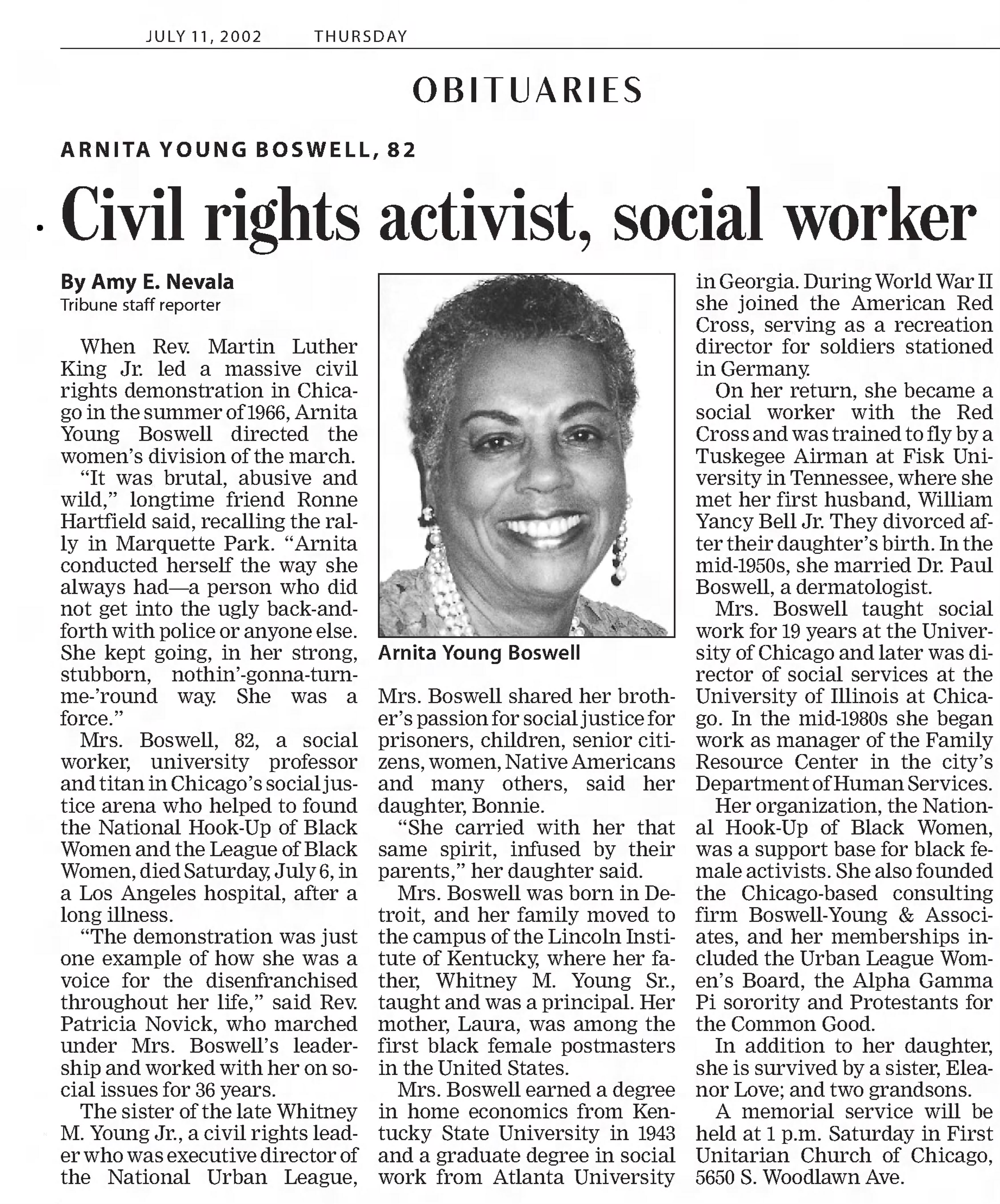- Chicago Urban League records, Special Collections and University Archives, University of Illinois at Chicago, Arnita Boswell, 1973 IV-123, IV – 1475