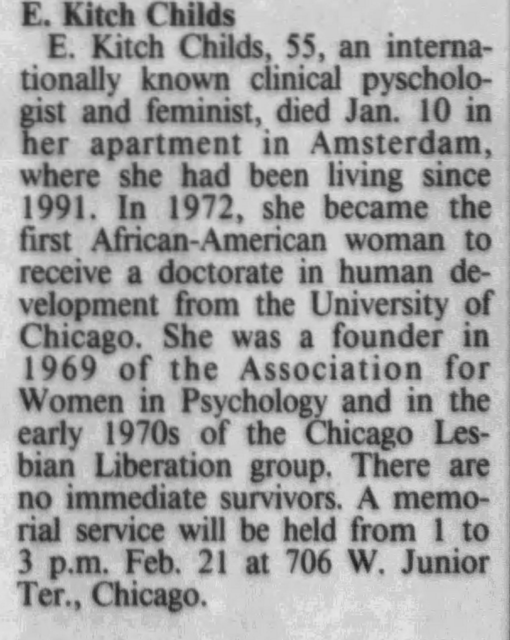 Clinical psychologist and lesbian activist advocating for minority women, prostitutes, gays and lesbians. A founding member of the University of Chicago’s Gay Liberation and the first African-American woman to earn her doctorate degree in Human Development at the University of Chicago. Founding member of the Association for Women in Psychology (AWP) with Phyllis Chesler and Dorothy Riddle.