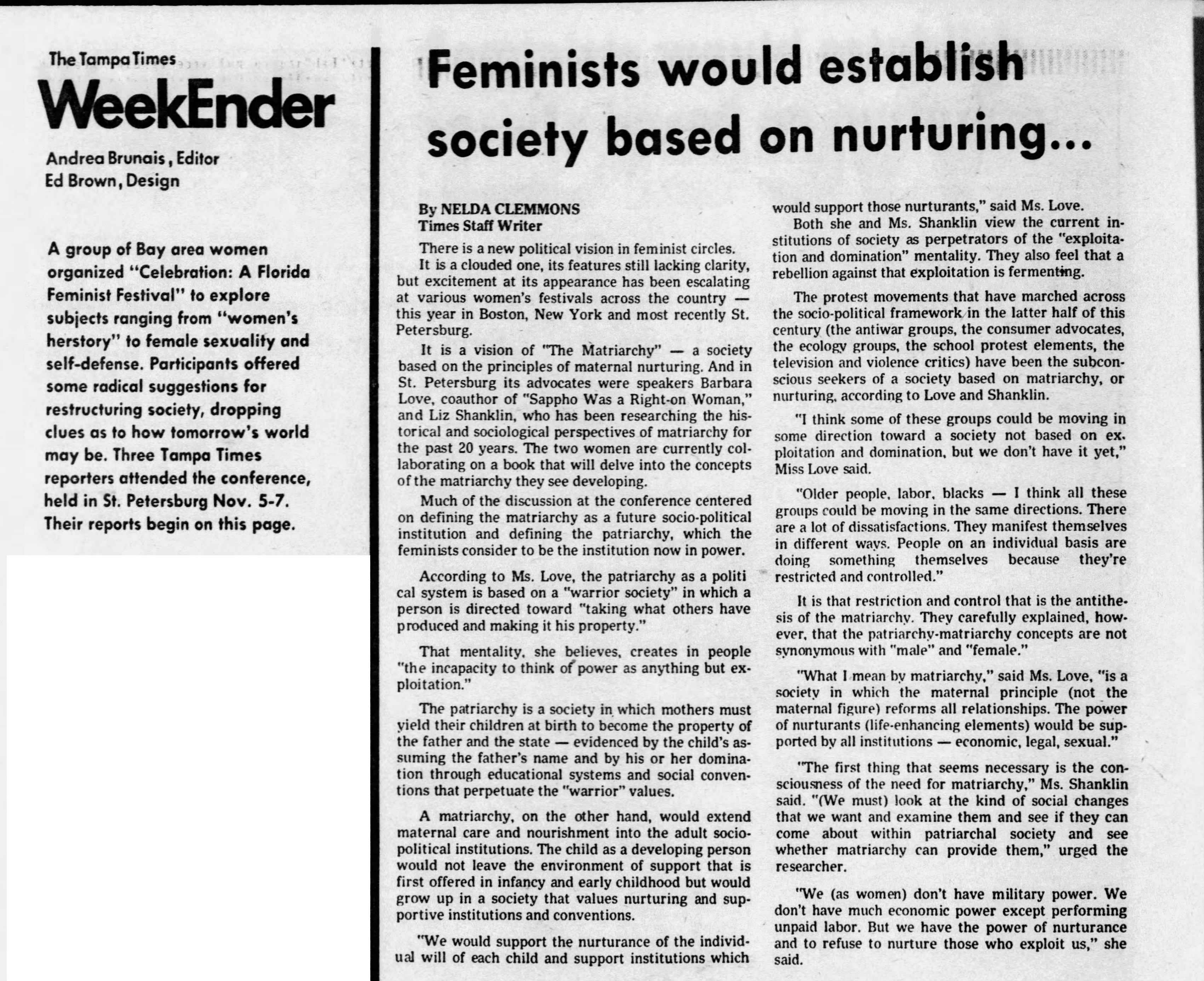 - “Feminists would establish society based on nurturing,” by Nelda Clemmons, Tampa Times, November 20, 1976