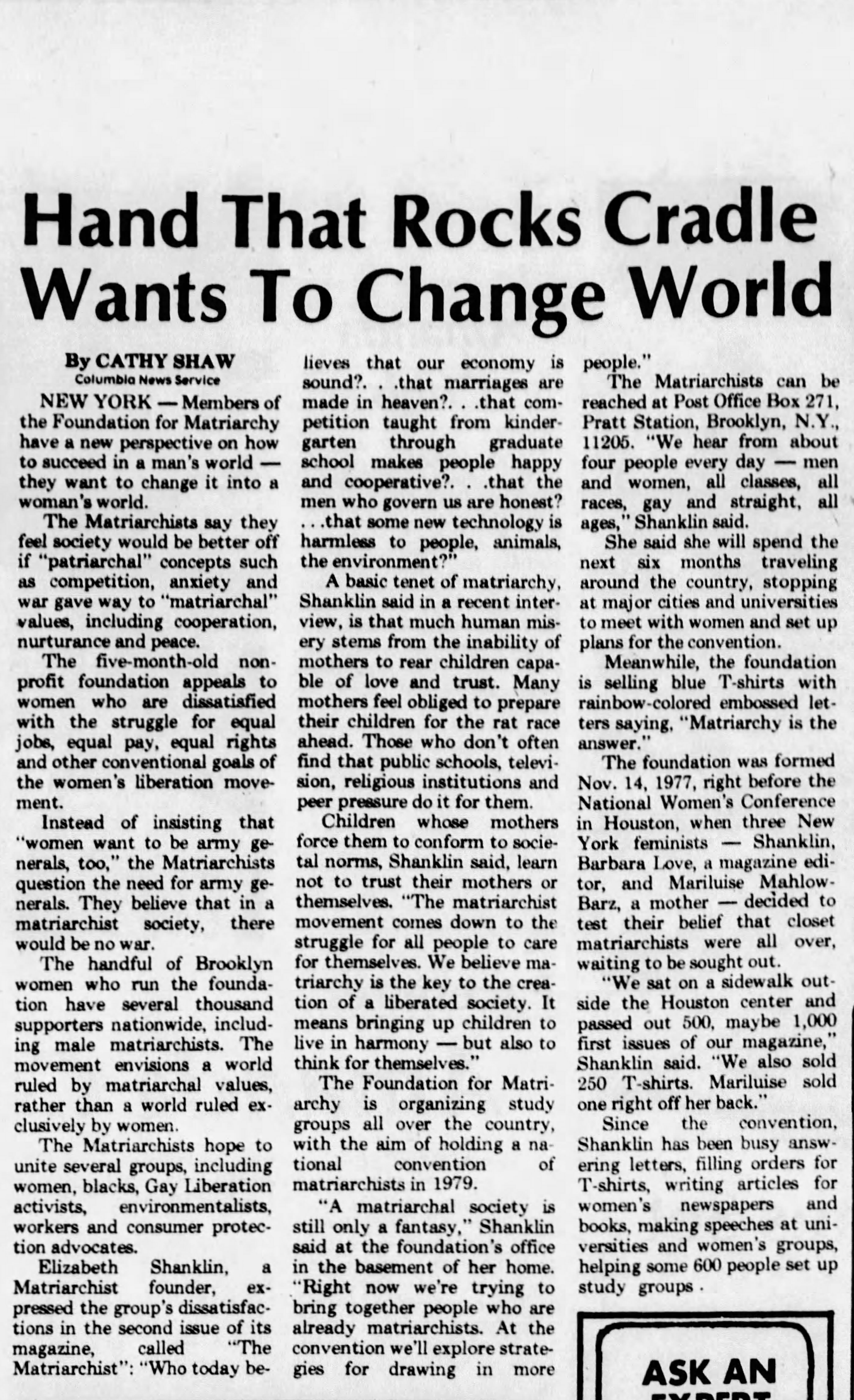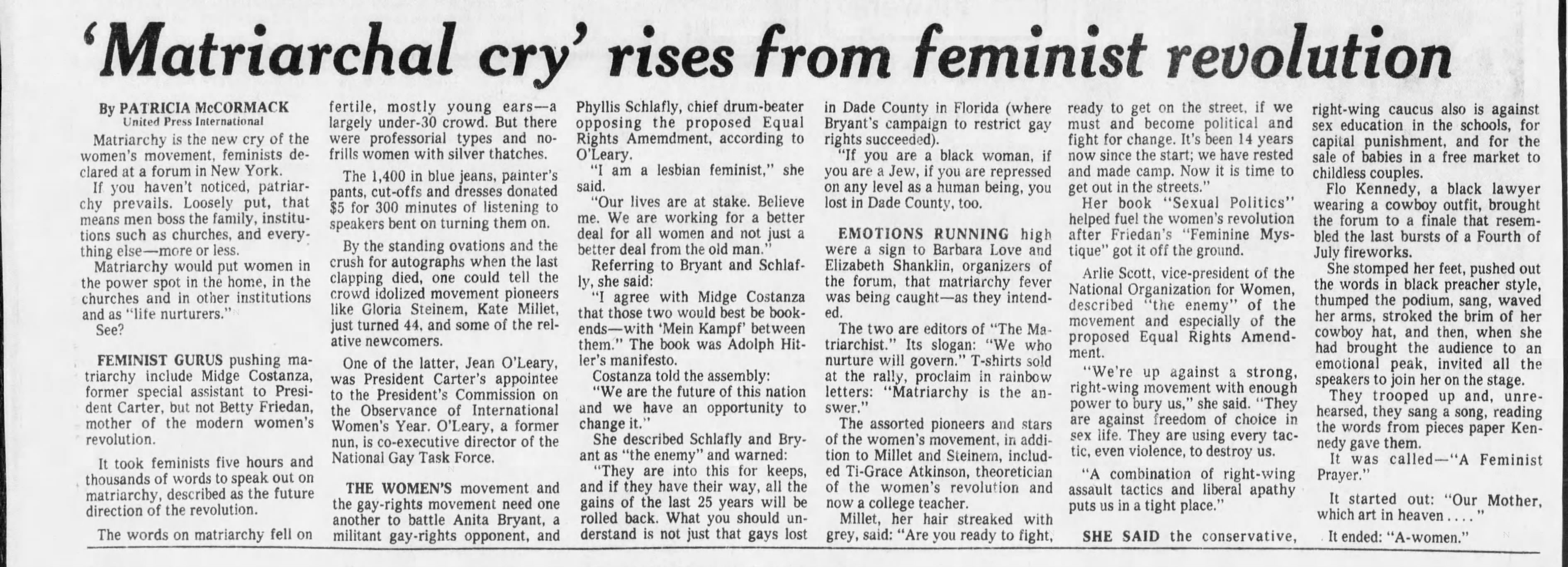- “Matriarchal cry rises from feminist revolution,” by Patricia McCormack, Minneapolis Star, September 25, 1978