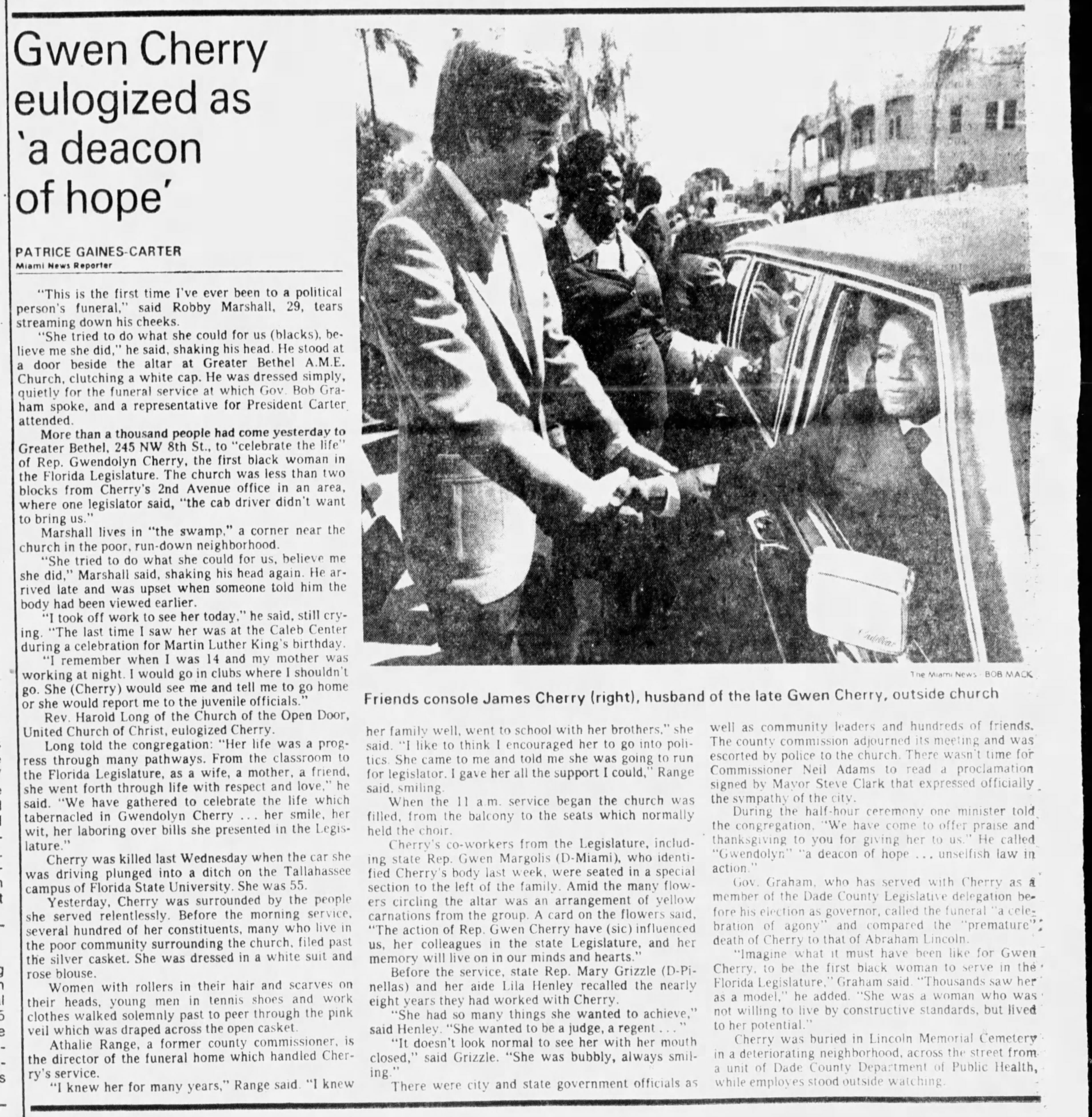 - Gwen Cherry eulogized as ‘a deacon of hope’ – Miami News February 14, 1979