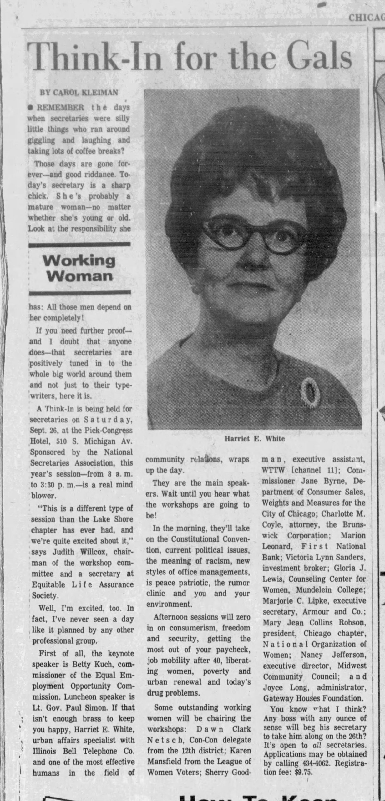 “I wish I had a quarter for every time someone asked me what feminists really want. ‘Do women really want a world without men? Don’t women like being taken care of? Isn’t it flattering to be called a girl when the woman is clearly middle-aged?’ They are missing the point. None of these things are issues. Feminists are really talking about options and choices. We want our own identity, not one coming from the men we are associated with.” – Harriet White, Urban Affairs Specialist and EOO coordinator, Illinois Bell Telephone Co., October 1973