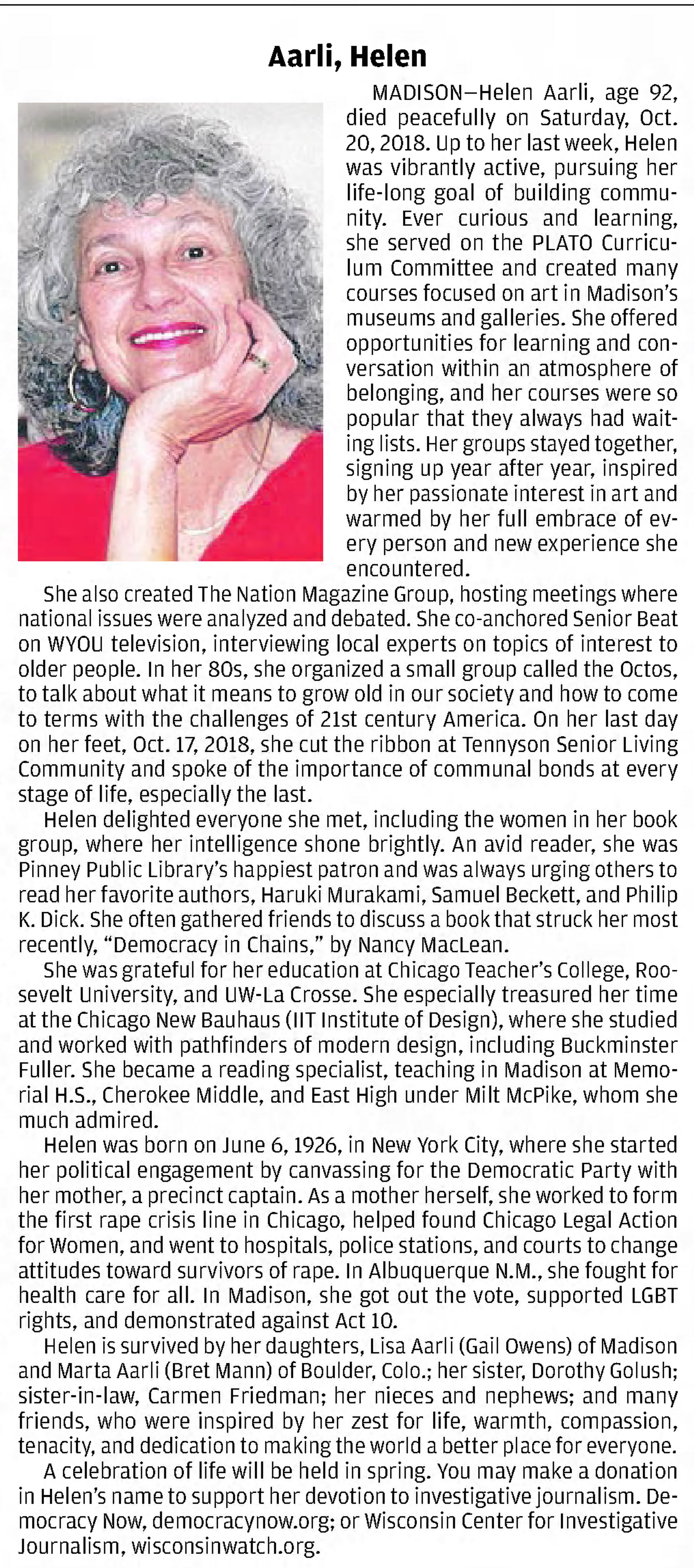 - Oral history with Helen Aarli 1999, Spertus Institute for Jewish Learning and Leadership