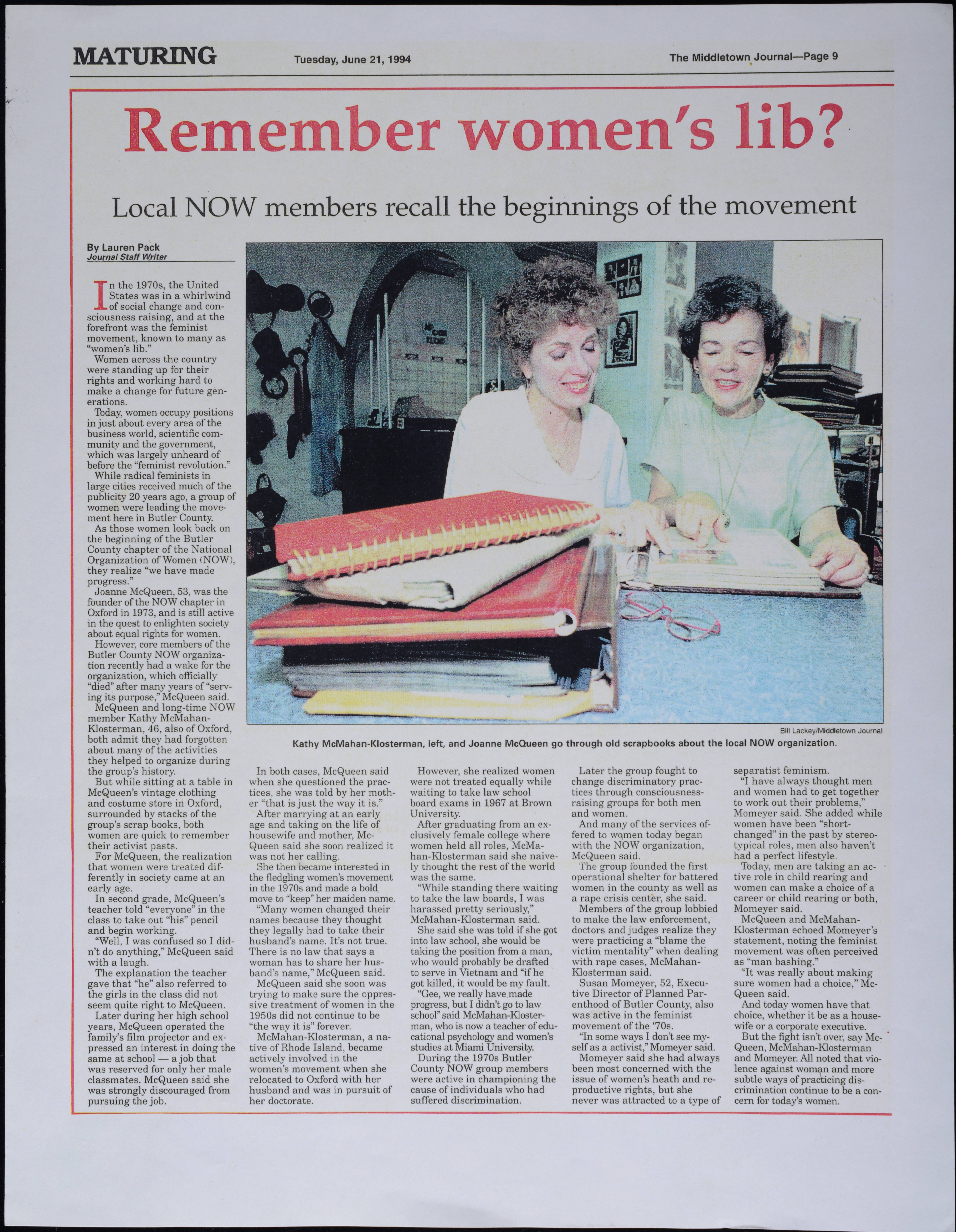 - Kathy McMahon-Klosterman and Joanne McQueen, Local NOW members recall the beginnings of the movement, 1994