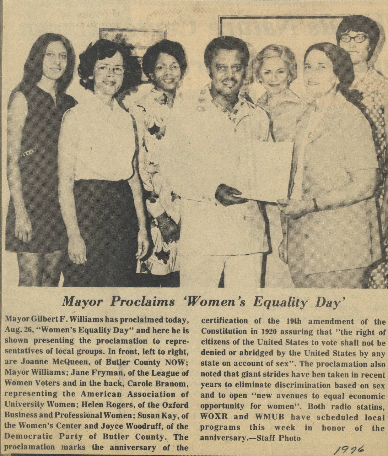 - Mayor Proclaims Women’s Equality Day, August 26, 1976