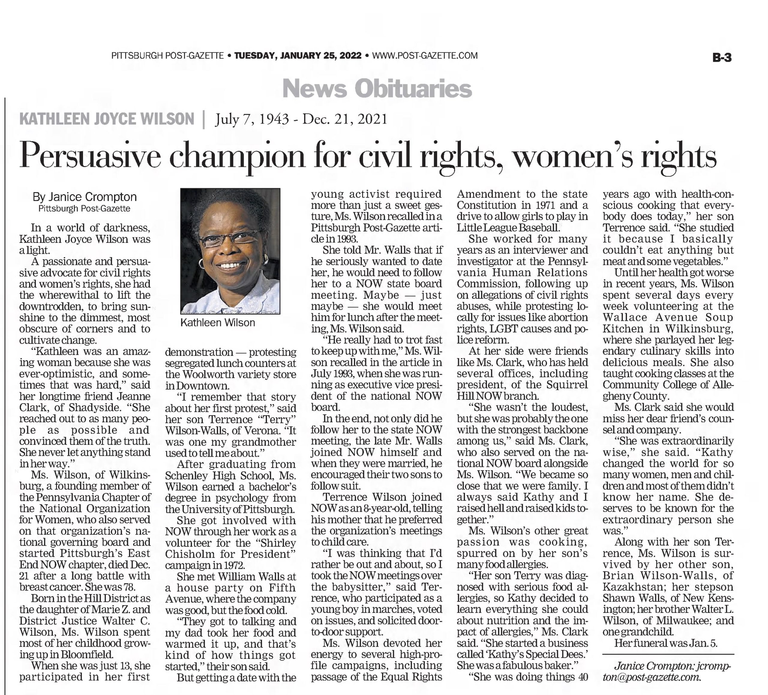Founding member of the Pennsylvania Chapter of the National Organization for Women (NOW), and founder of the East End Chapter of NOW. Served in various leadership positions in the State of Pennsylvania NOW and National NOW. Received numerous honors and awards for her tireless fight to defend human and women’s rights.