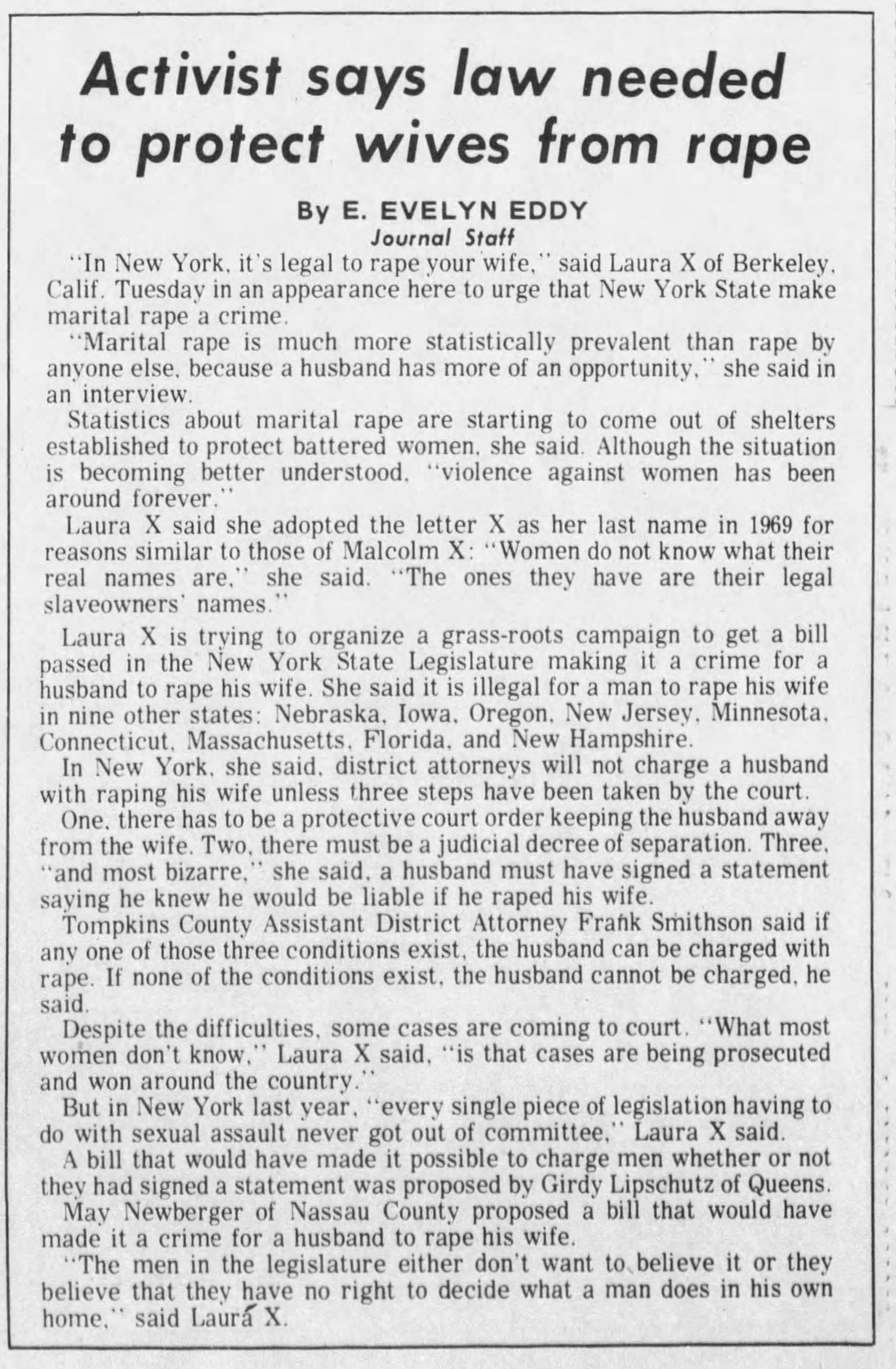 - In 1978, Laura X founded and directed the research and campaigns of the National Clearinghouse on Marital and Date Rape after leading the successful campaign to criminalize marital rape in California in 1979, and she served as a consultant coordinator to campaigns that in 1993 successfully eradicated exemptions from prosecution for marital, date and cohabitation rape in the remaining 44 other states.