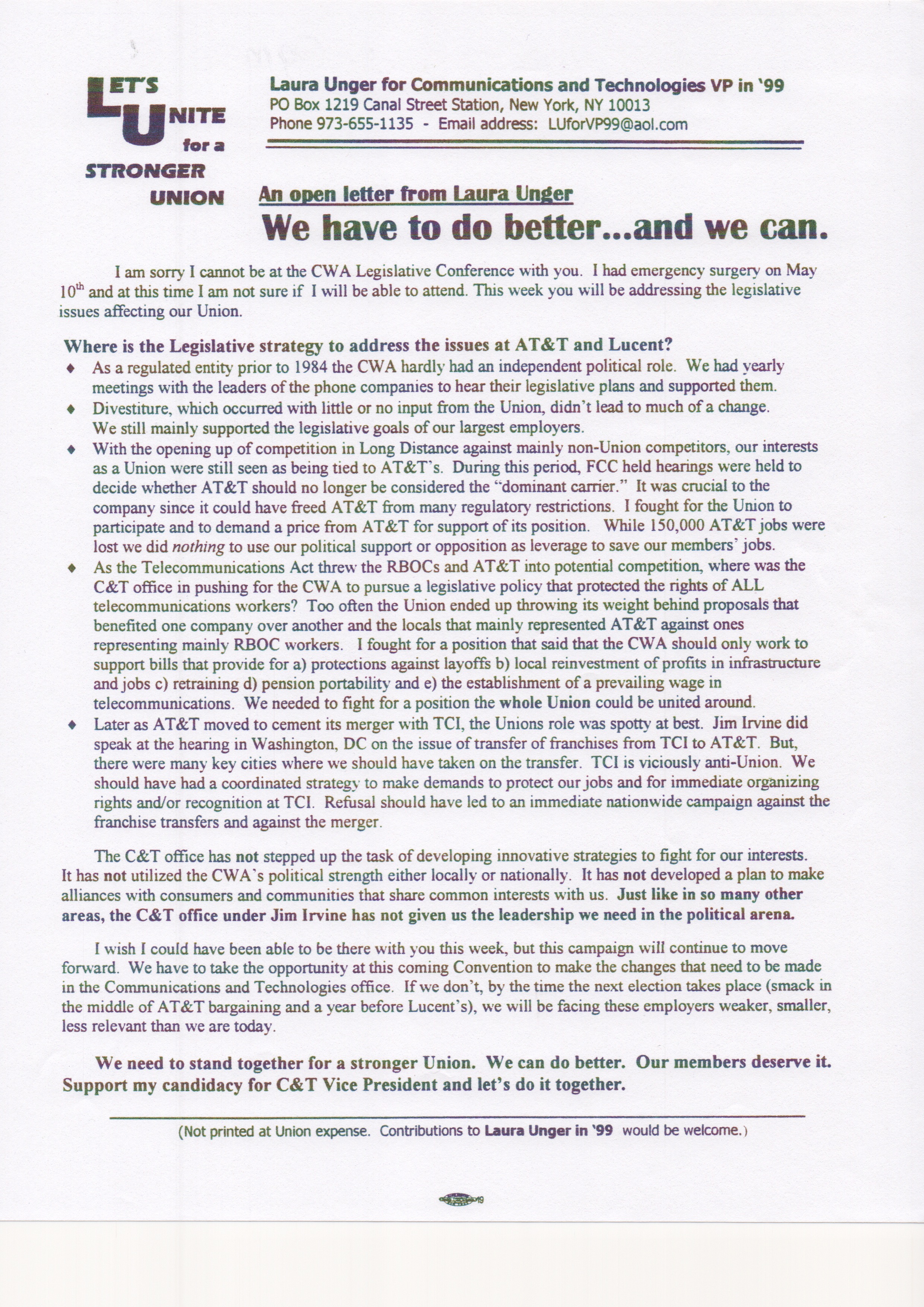 - Laura Unger for Communications & Technologies VP ’99 – An Open Letter