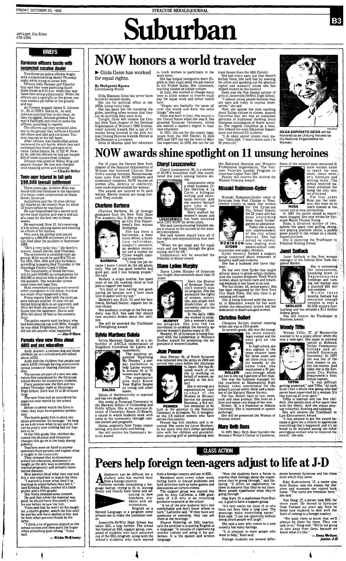 - Central New York N.O.W. “Unsung Heroine” Trailblazer Award, 1992