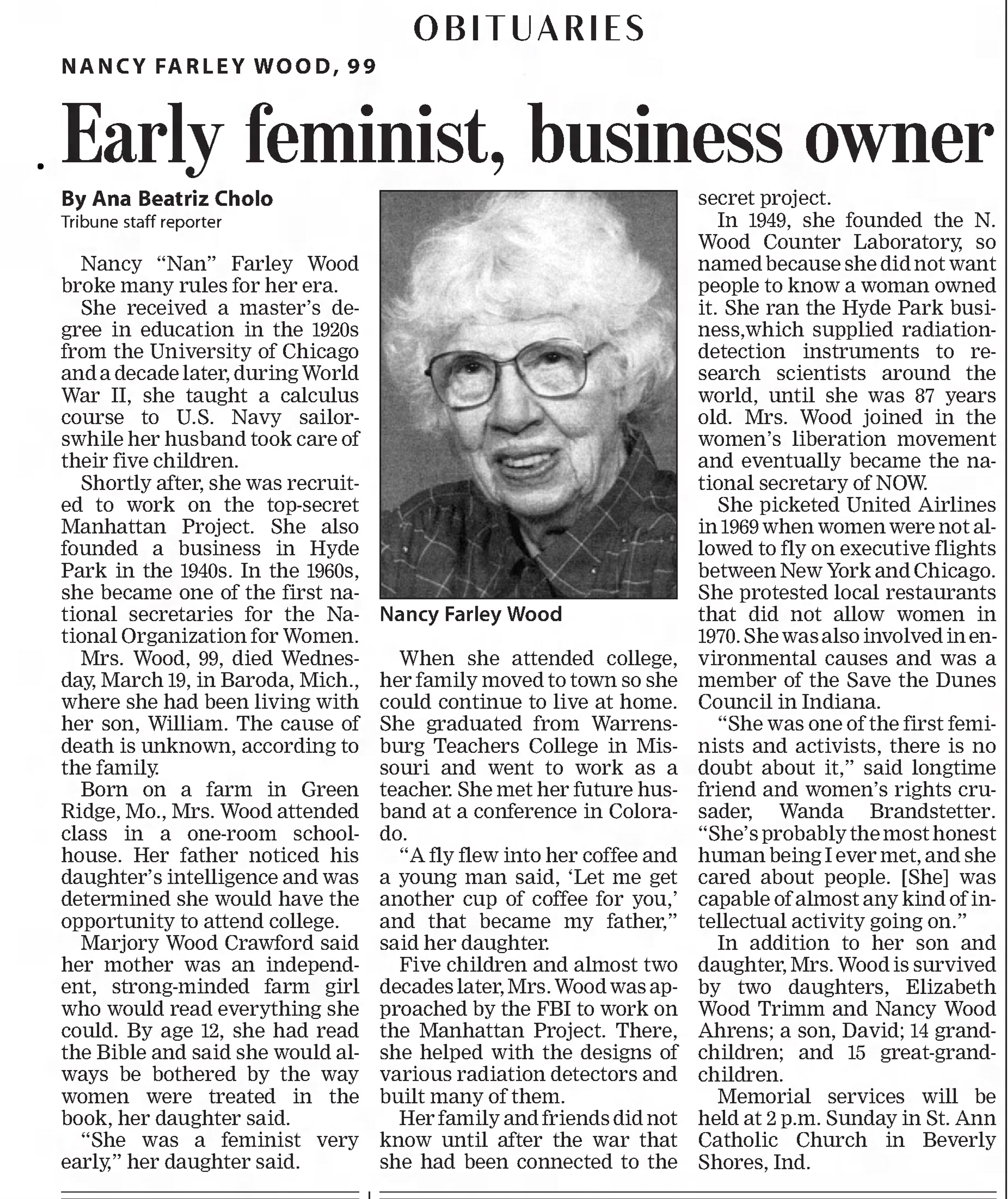 - Nan Wood’s Obituary, Chicago Tribune, May 17, 2003