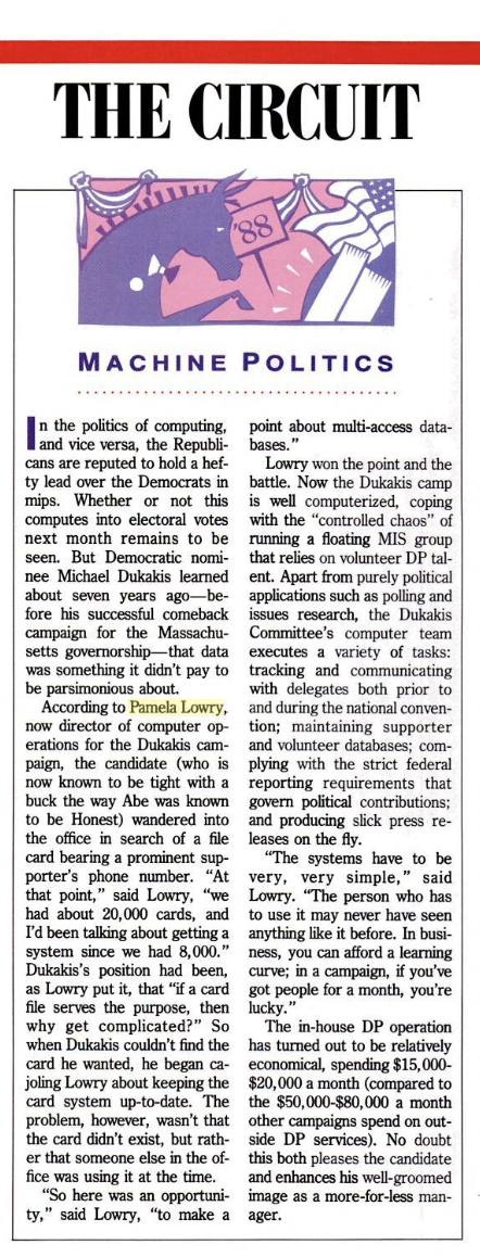 “Asking a political professional in 1988 how they use a computer is like asking a reporter how they use their telephone.” Pamela Lowry, Director of Computer Operations for Democratic candidate Michael Dukakis, 1988